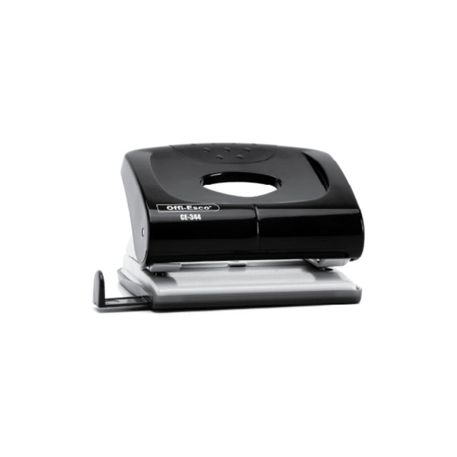 Perforadora de 2 huecos con cuerpo plástico y componentes metálicos, ideal para uso escolar y de oficina. Perfora hasta 15 hojas estándar con facilidad y precisión.