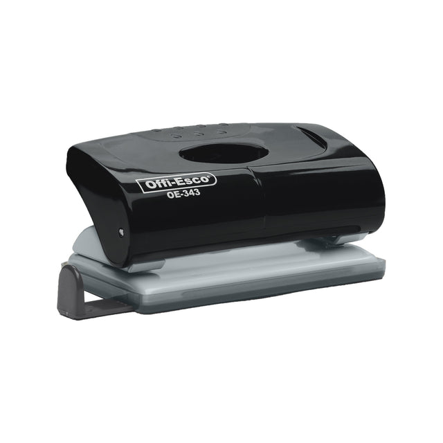 Perforadora de 2 huecos con cuerpo plástico y componentes metálicos, ideal para uso escolar y de oficina. Perfora hasta 10 hojas estándar con facilidad y precisión.