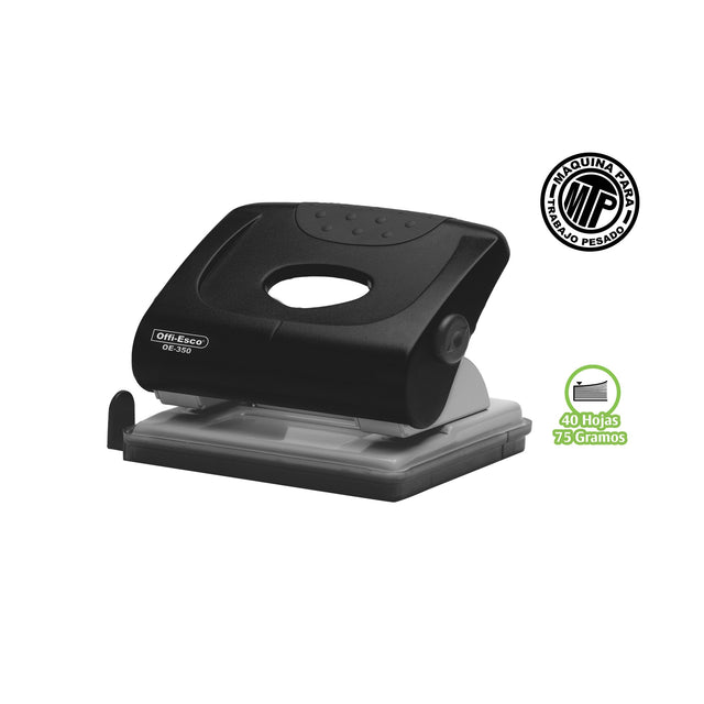 Perforadora de dos huecos con diseño robusto, ideal para trabajos pesados en entornos exigentes. Su palanca interior 100 % metálica ofrece mayor fuerza y durabilidad. Perfora hasta 40 hojas de 75 g con facilidad. Incluye ventana para desalojo de virutas que facilita el mantenimiento. Perfecta para oficinas, archivos y espacios industriales.