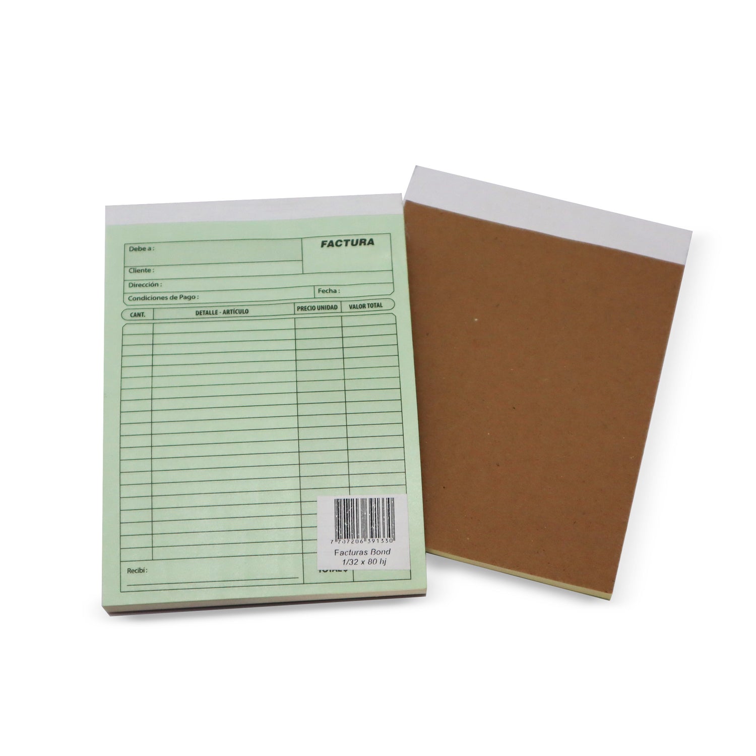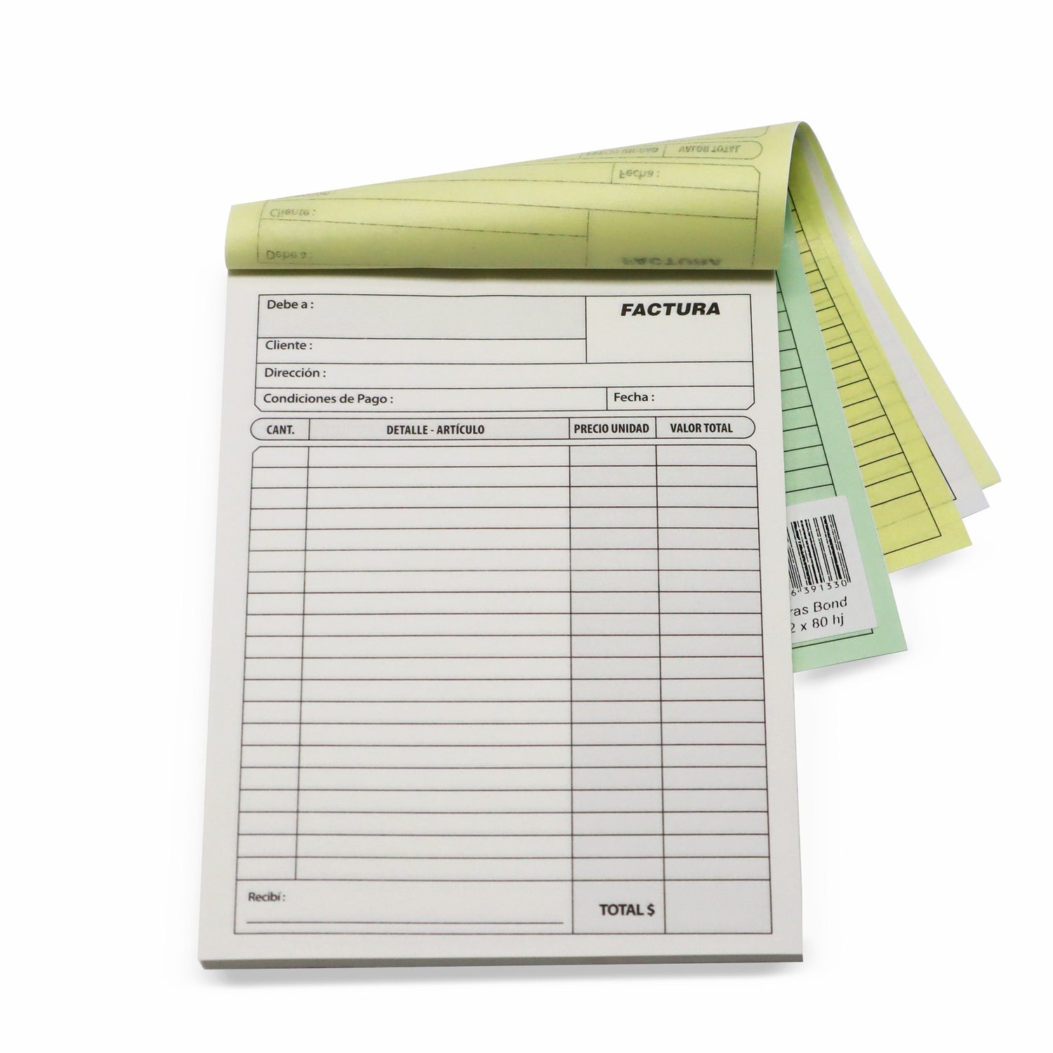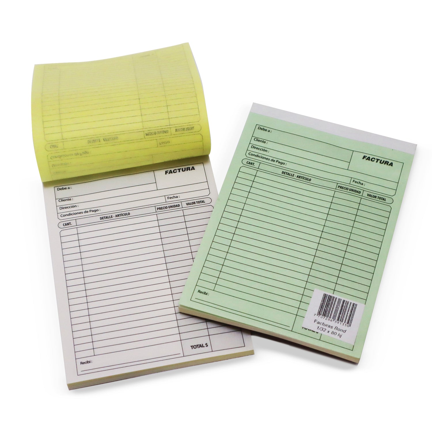 Facturas con original en papel bond 60 g y copia en papel manifold 60 g, ideales para documentar operaciones comerciales en diferentes formatos.